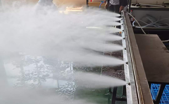 干雾抑尘装置是由压缩空气携带一定压力的水源,通过雾化喷嘴形成高频声波将水高度雾化,由干雾抑尘设备书送来的气、水并将其转化成颗粒直径为5-10μm的干雾按干雾抑尘设备的控制指令喷向抑尘点。喷雾箱上的雾化喷嘴能使水、气均匀混合,产生微细的干雾喷射出去,每个喷嘴都能提供一个特定的喷雾形状、特定流量和喷雾覆盖范围,所有均匀封闭排列的喷嘴形成一道“雾墙”,与粉尘颗粒相互接触、碰撞,使粉尘颗粒相互粘结、凝聚变大,并在自身重力作用下沉降,从而达到抑尘的作用压缩气流携带着水源到达喷头雾化共振腔室后,蓄势介质压力将干雾颗粒以柔软低俗的方式将雾状截止喷射到粉尘发生点,将粉尘捕捉、聚结而坠落,达到抑尘目的。